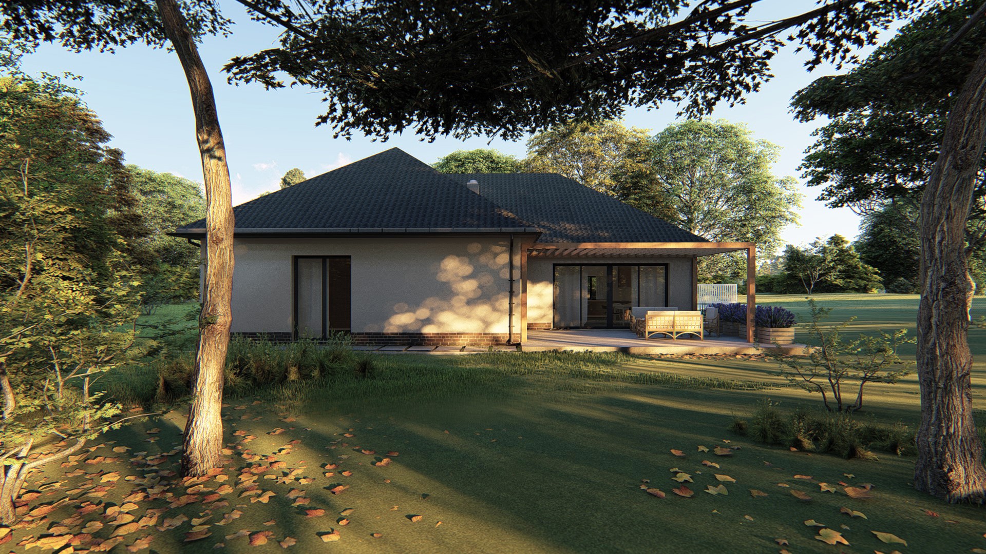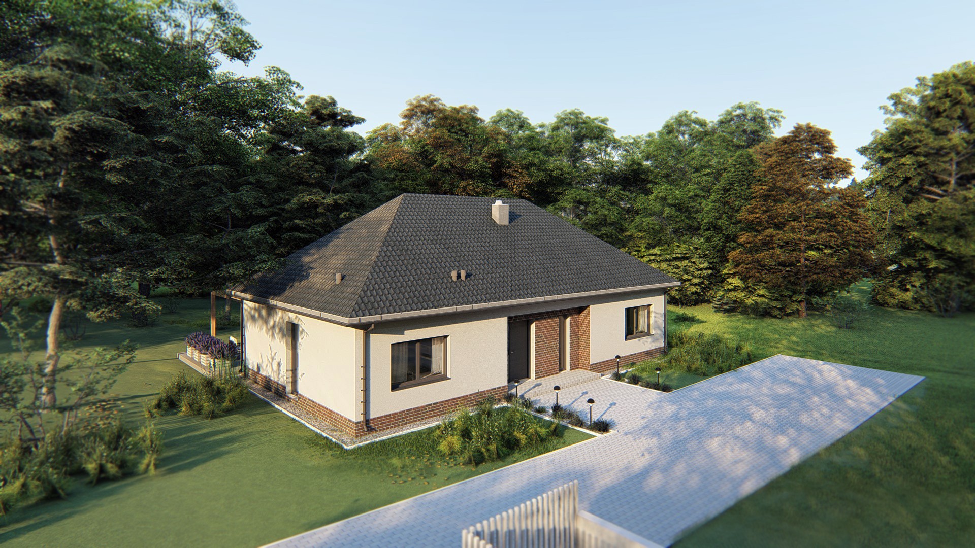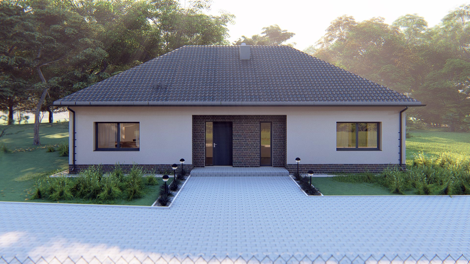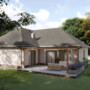 Projekt parterowego domu jednorodzinnego. Budynek pomimo prostej formy i niewielkiej powierzchni zawiera wszystko co konieczne dla zapewniania komfortu użytkowania – 3 pokoje, spiżarnię, kotłownie, gabinet, dwie łazienki, kuchnię i przestronny salon.